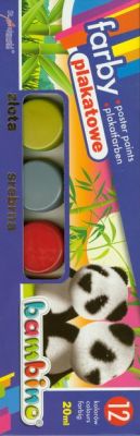 Farby plakatowe Bambino 12 kolorów. Zawiera złotą i srebrną farbę.